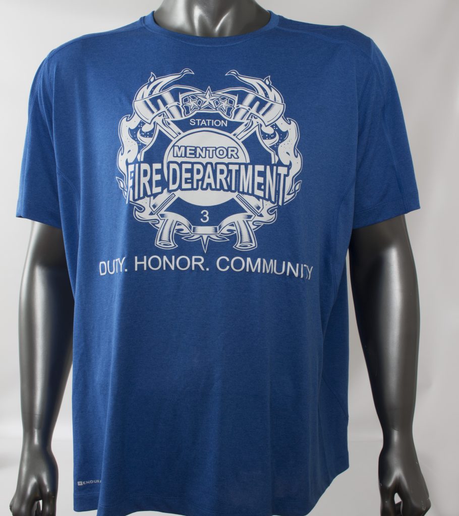 If the job requires a reflective t-shirt we offer in stock reflective transfers that say FIRE or EMS. These are printed in 3” letters. FIRE is 8.25” wide and EMS is 8” wide. To customize you can add a metallic silver transfer above or below the reflective word.