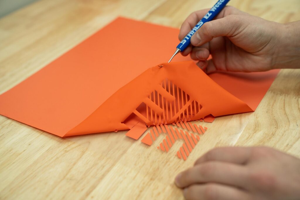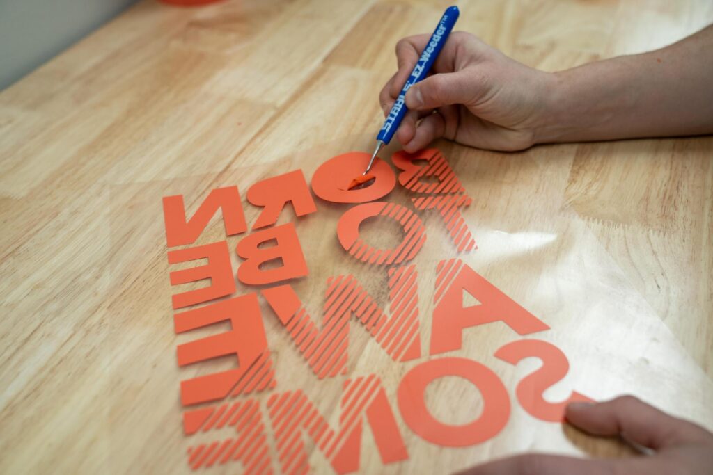 After cutting, remove the excess vinyl to reveal your design. Using a weeding tool, peel away the unwanted material from the carrier sheet. Be sure to remove vinyl from any interior spaces in your artwork, such as inside letters or logos with negative space.