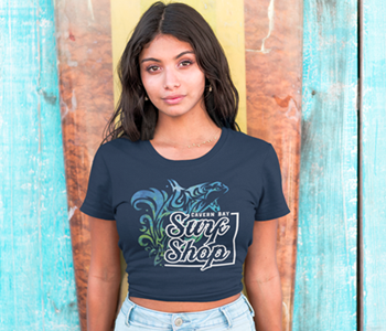 Your customers will love new layout 3D-434 for Surf shops or beach events simply by customizing the text. Shown on a District ® Women’s Scoop Neck Tee (DM106L) below, this design using the new Stretch Litho Matte can be applied with your heat press to light or dark colors for an opaque print. The new Surf Shop design layout features a dolphin clip art W2F-6.