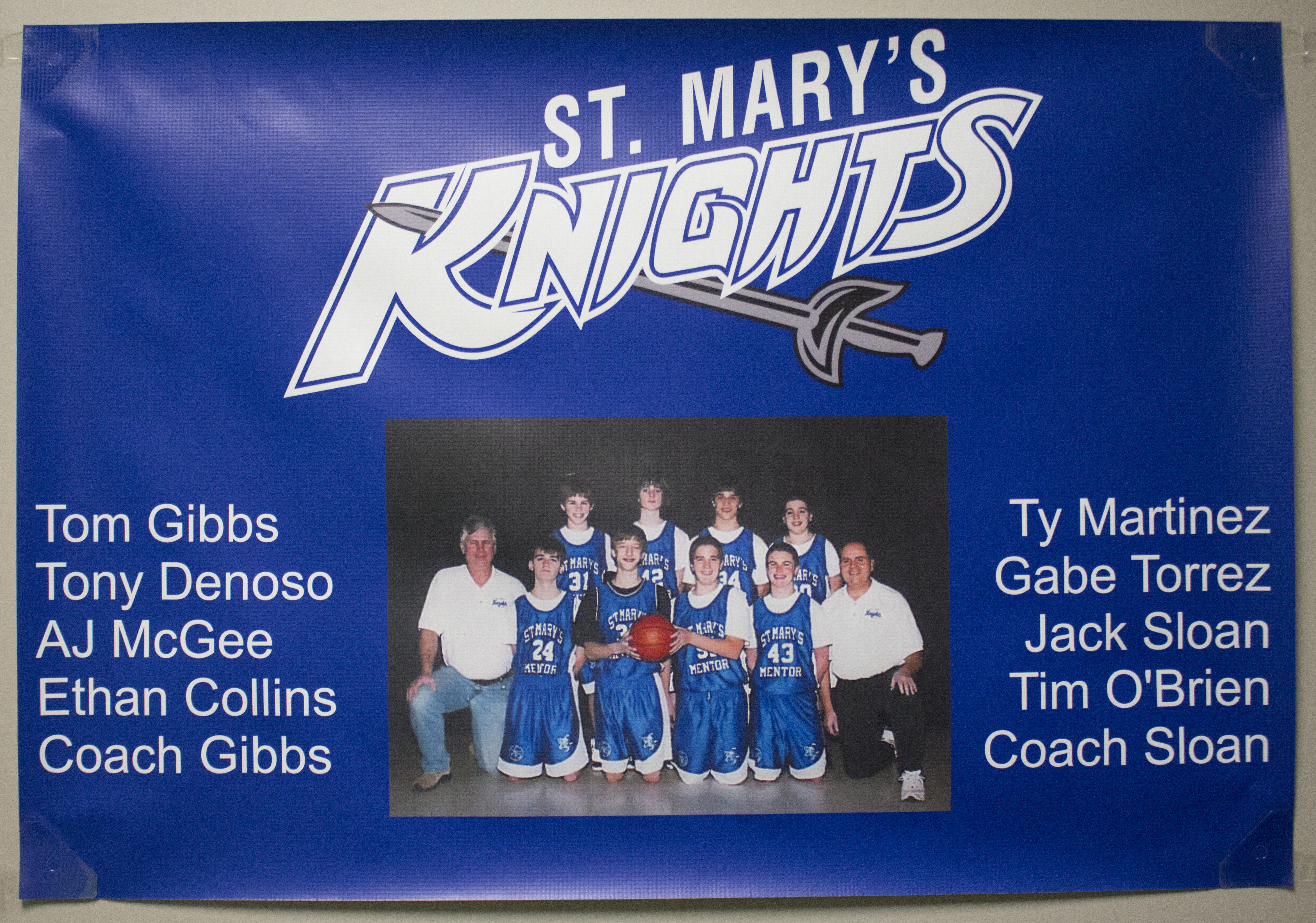 You can make the custom banner any color or use white. You can add layouts, text, photos or any other art that will be needed. On the banner shown below I used Easy Prints layout MAS-73 for the St. Mary’s Knights logo. I then used the add text, add multi line text to add the player’s names to each side. Finally I used the Add Your Artwork button and added the team photo.