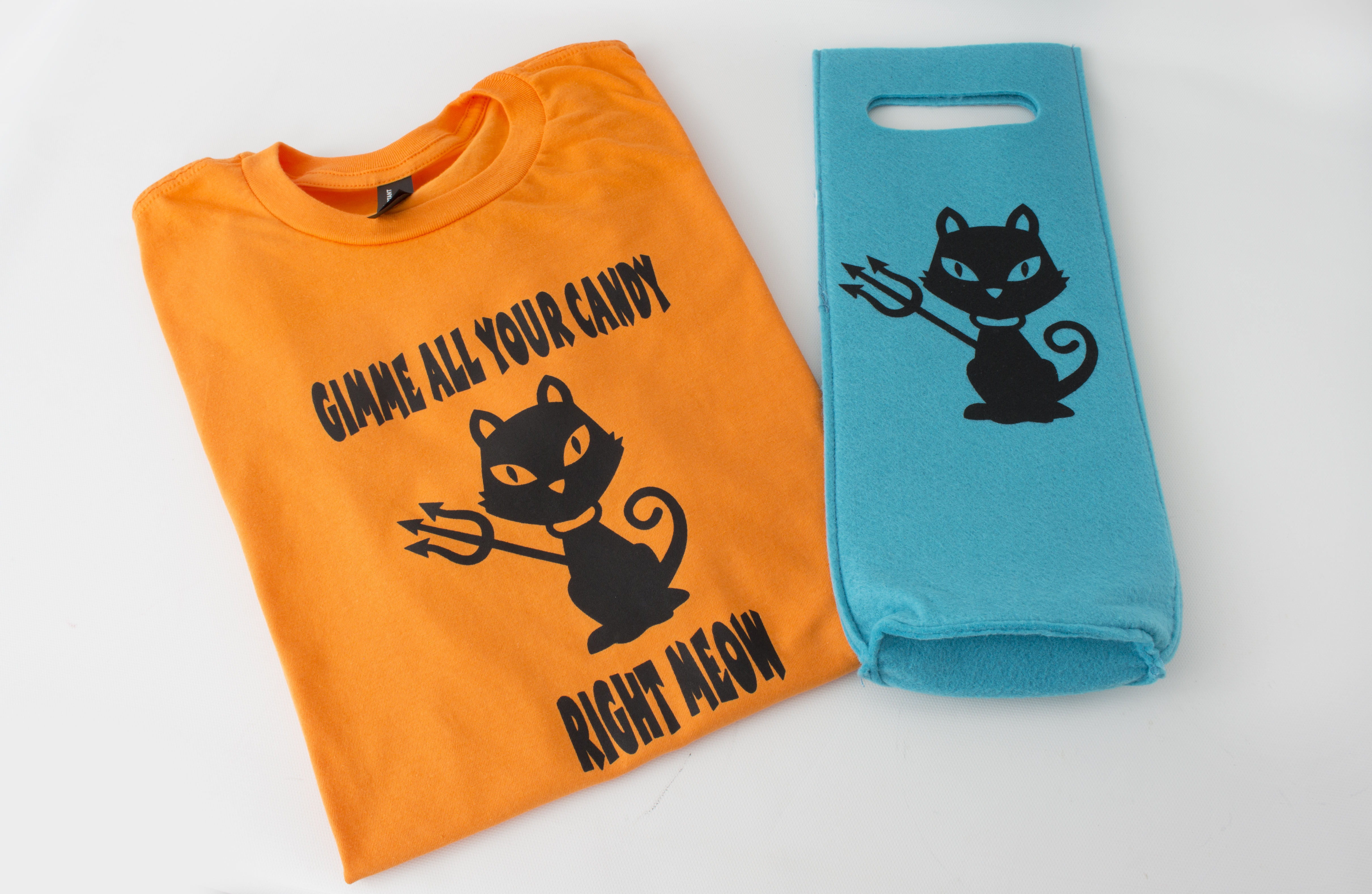On the orange shirt and manila tote bag, you can see what the entire design looked like. For the teal colored wine bag, we simply cut the text and used just the cat and pitchfork.