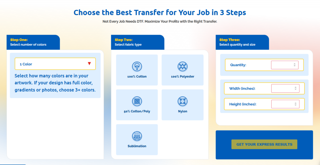 Our new Transfer Selector Tool helps you choose the right transfer every time. Just answer three quick questions, and we’ll recommend the best transfer based on your order size and garment type. We even factor in cost-effectiveness and fabric compatibility, so you can order with confidence, and boost your profit margins.