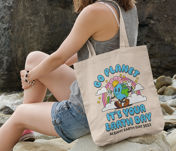 New Earth Day layout 3D-566 is a trendy style with bubbly letters and happy, bright graphics. Shown below on a Port Authority® Eco Blend Canvas Tote BG420 in Natural.
