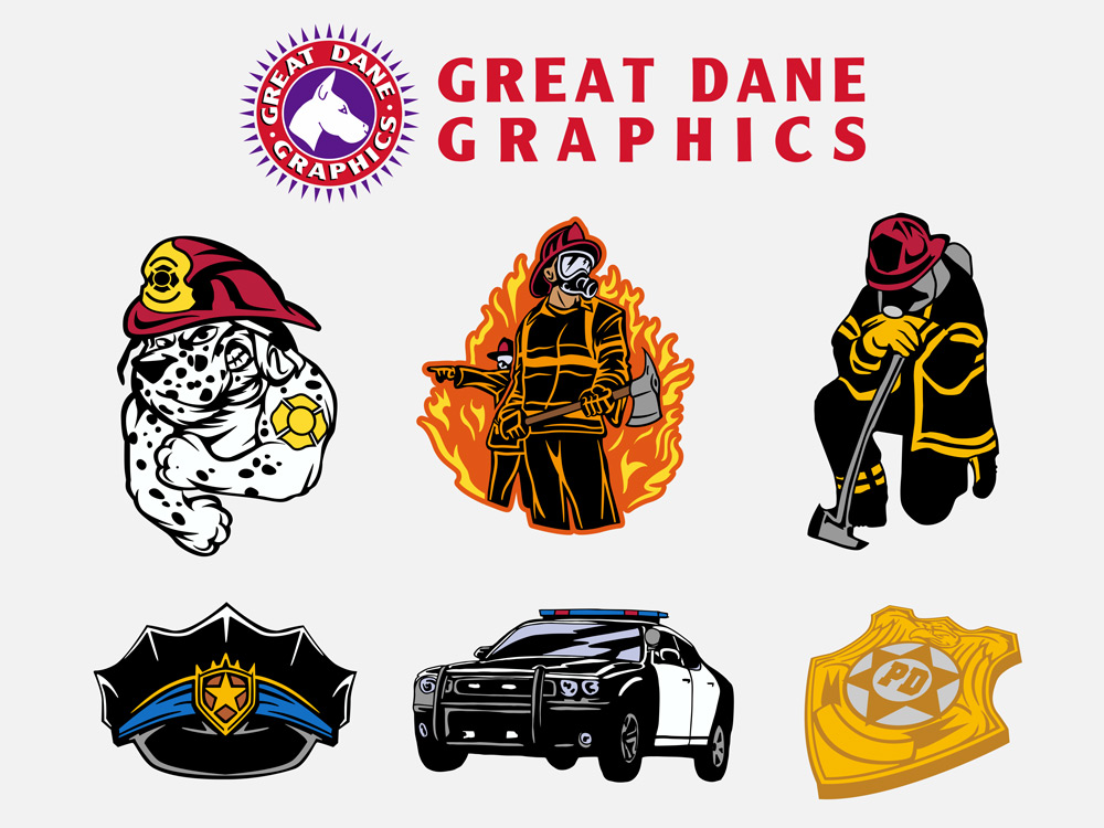 Artwork Ideas and Tips New Police and Fire Clip Art From Great Dane Graphics Dealer ServicesNovember 1, 2016November 14, 2017 artwork, badge, Clip Art, cop car, dalmatian, dog, fire fighter, new, police, T-shirt Designer